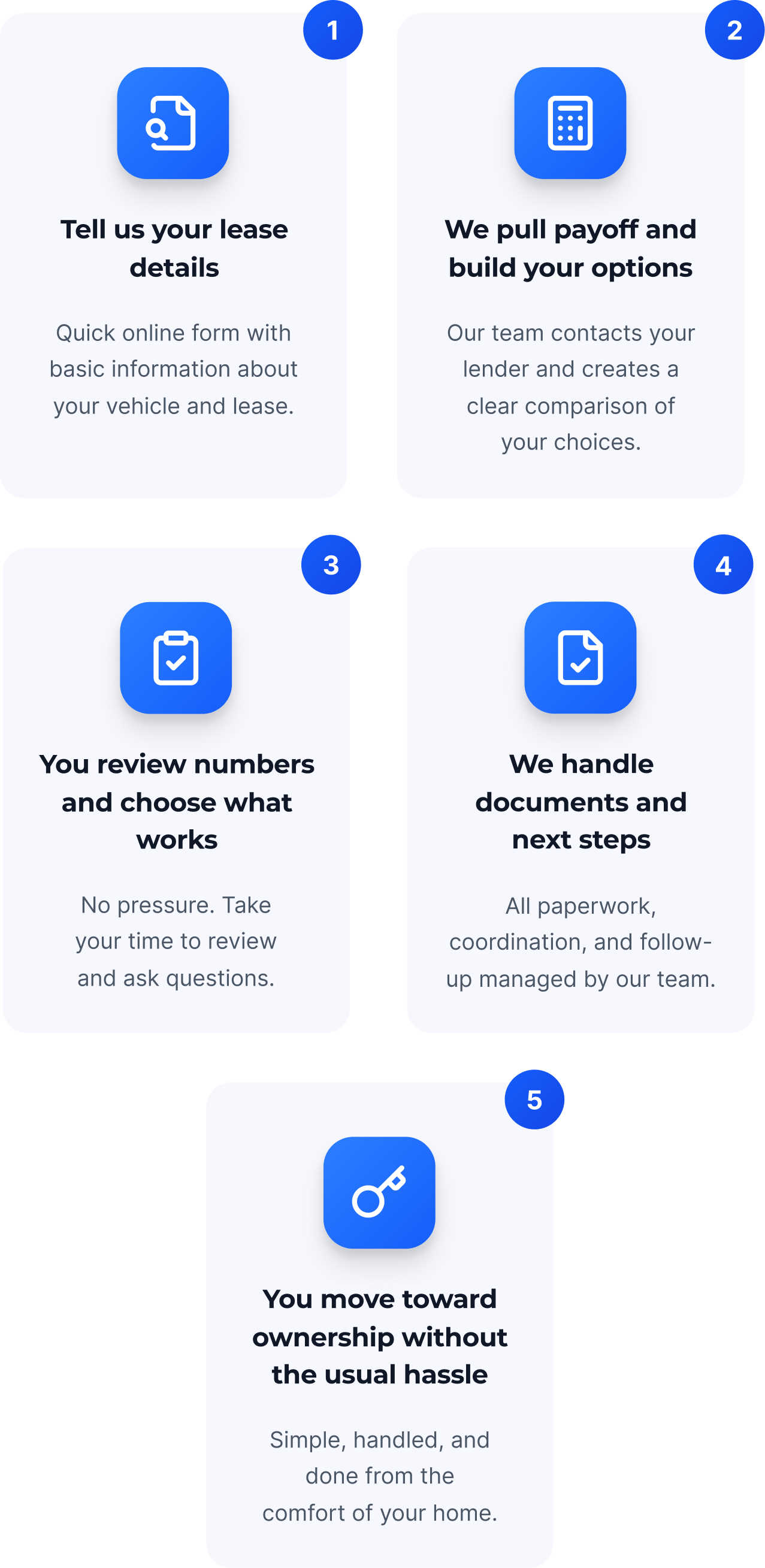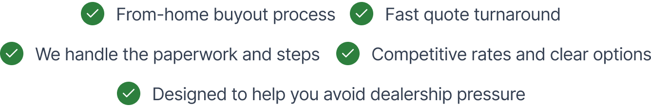 Once we have your vehicle and lease details, we’ll work on getting your payoff and building your options. Speed depends on payoff availability and how quickly any required steps (like a credit application, if financing) are completed.